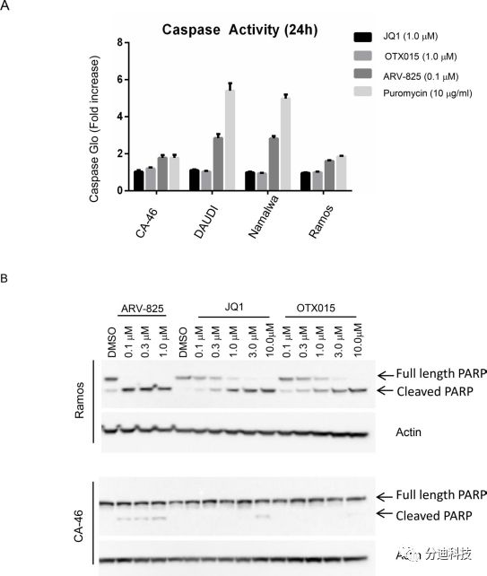 PROTAC等蛋白降解或屏蔽方法的不足 PROTAC或其它方式对BRD4功能的更完全和更持久的破坏将有益于患者,因为其更有效的靶向和更少的给药方案。但它也可能与更严重的副作用相关,因为BRD4以细胞背景依赖的方式调节多种生物过程。使用诱导型和可逆转基因BRD4靶向RNAi小鼠模型的最新发现阐明了有效和持续的BRD4靶向的潜在局限性,包括表皮增生,脱发和小肠中的细胞多样性和干细胞减少。这代表了药物开发中常见的两难问题,即确定是否以及如何在临床中实现最佳治疗指数。可喜的是,这些Brd4抑制的靶向副作用似乎是可逆的,可以设置一个治疗窗口来更好地管理BRD4靶向治疗。 图5 ARV-825比小分子抑制剂对BL细胞凋亡诱导具有更好的效果
