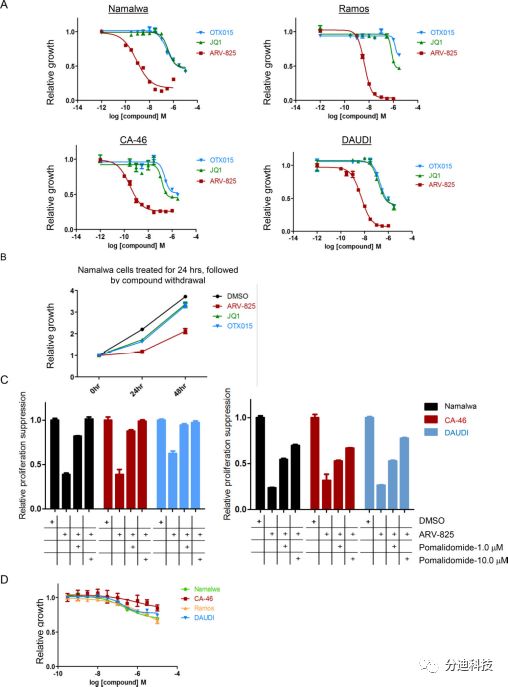 OTX015和泊马度胺与它们各自的靶标BRD4和Cereblon的结合亲和力分别为10nM和3μM。令人兴奋的是,基于这两种配体的ARV-825在低于1nM时达到BRD4 的DC50,这有力地表明作用于BRD4的PROTAC能够参与蛋白质降解的多个循环,并且开发了由靶配体组成的功能性降解物的方法。所述靶配体虽具有较低的亲和力,但可提供功能效应。因此,许多缺乏酶活性位点但可被小口袋中的小分子结合的靶标可能变成具有PROTAC介导的降解的“可药物”。 图4 ARV-825比BRD4抑制剂对BL细胞增殖抑制具有更好的效果